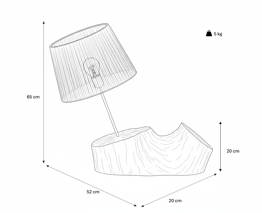 The wooden base, shaped by time and handcrafted, is cleaned, sanded, treated against insects and fungi and sealed before receiving a smooth finish with natural beeswax, preserving the marks, cracks and imperfections that tell its story. The lampshade, in turn, is created from a wire structure molded and welded manually, to which the paper raffia is intertwined, fiber by fiber — forming a unique pattern of shadow and light.