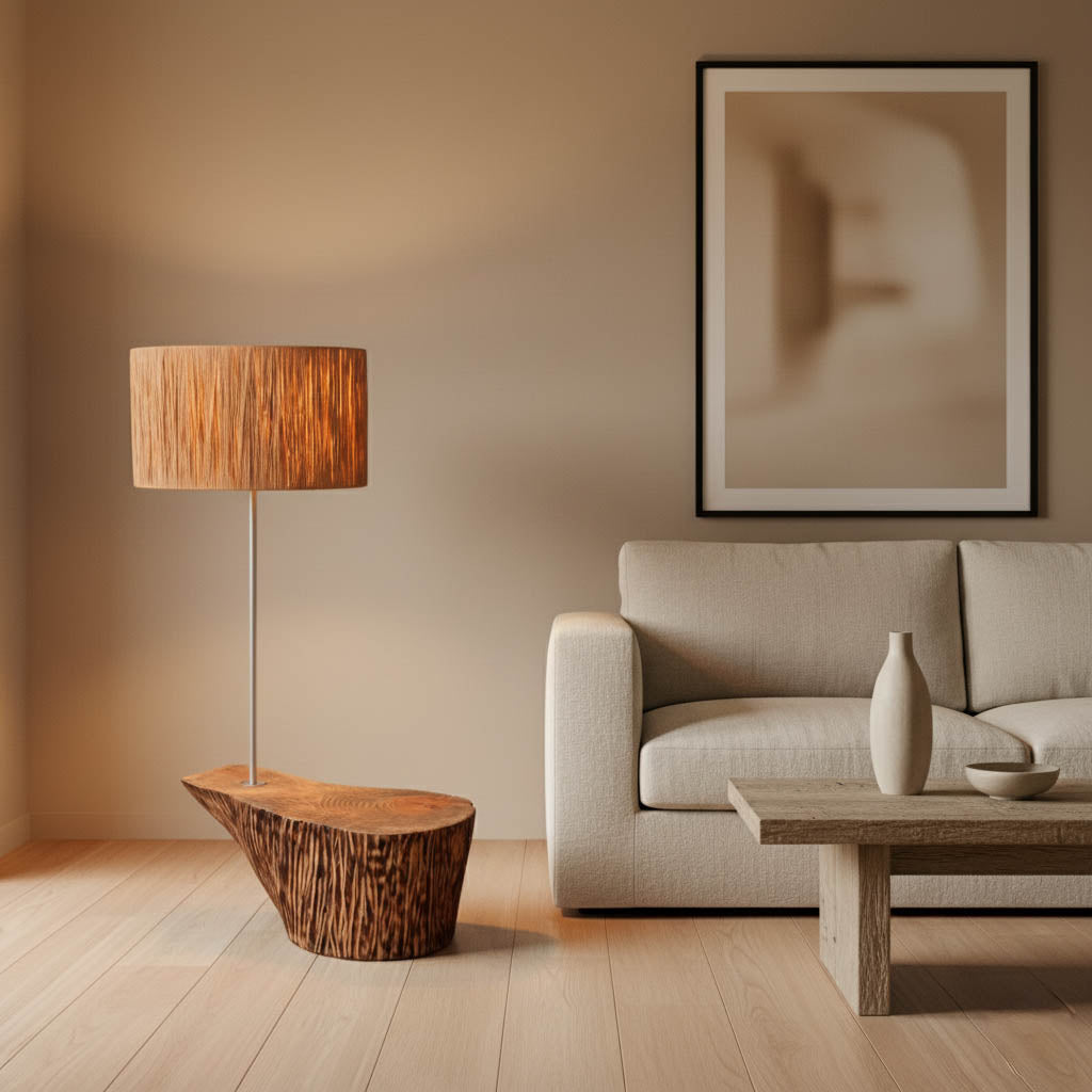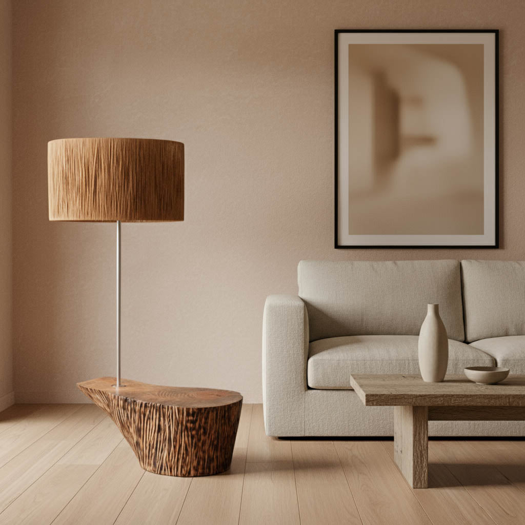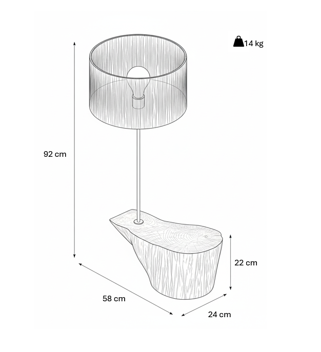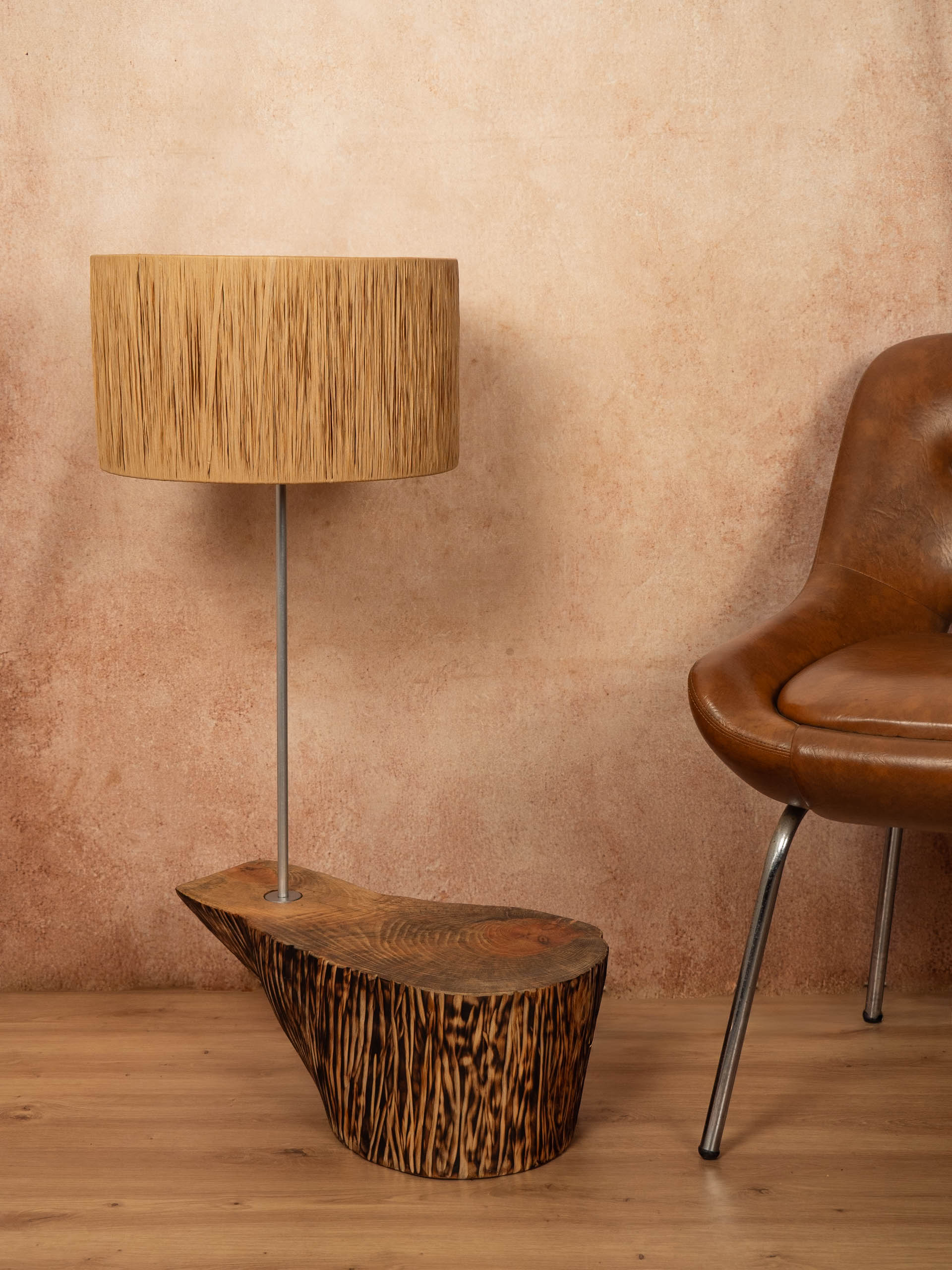 The wooden base, shaped by time and handcrafted, is cleaned, sanded, treated against insects and fungi and sealed before receiving a smooth finish with natural beeswax, preserving the marks, cracks and imperfections that tell its story. The lampshade, in turn, is created from a wire structure molded and welded manually, to which the paper raffia is intertwined, fiber by fiber — forming a unique pattern of shadow and light.