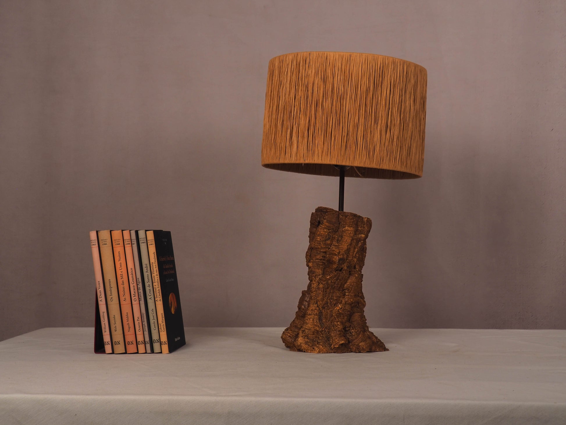 The wooden base, shaped by time and handcrafted, is cleaned, sanded, treated against insects and fungi and sealed before receiving a smooth finish with natural beeswax, preserving the marks, cracks and imperfections that tell its story. The lampshade, in turn, is created from a wire structure molded and welded manually, to which the paper raffia is intertwined, fiber by fiber — forming a unique pattern of shadow and light.