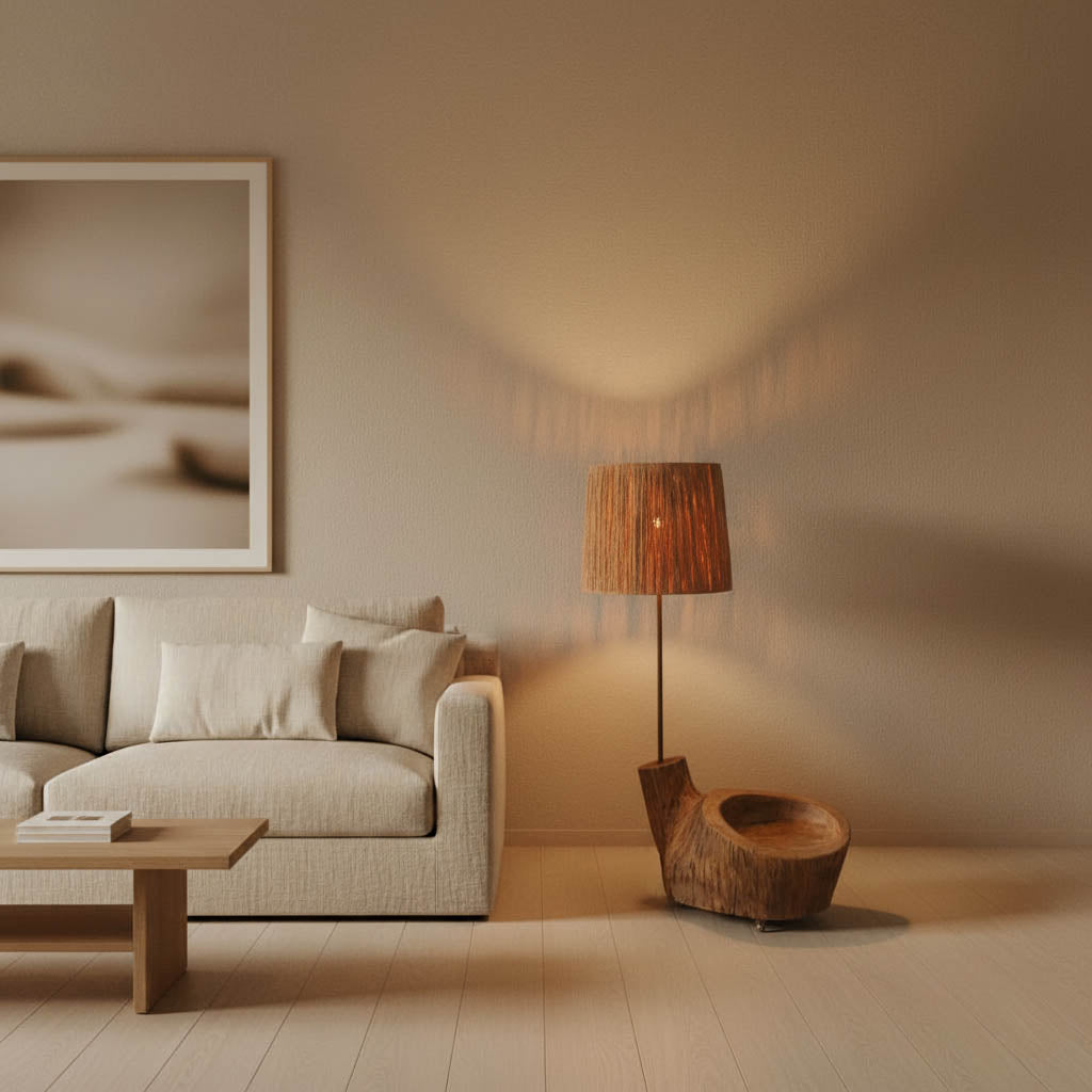 A base em madeira, moldada pelo tempo e transformada artesanalmente, é limpa, lixada, tratada contra insetos e fungos e tapa poros antes de receber um acabamento suave com cera de abelha natural, preservando as marcas, rachas e imperfeições que contam a sua história. O abajur, por sua vez, nasce de uma estrutura de arame moldada e soldada manualmente, à qual se entrelaça, fibra a fibra, a ráfia de papel — formando um desenho único de sombra e luz.