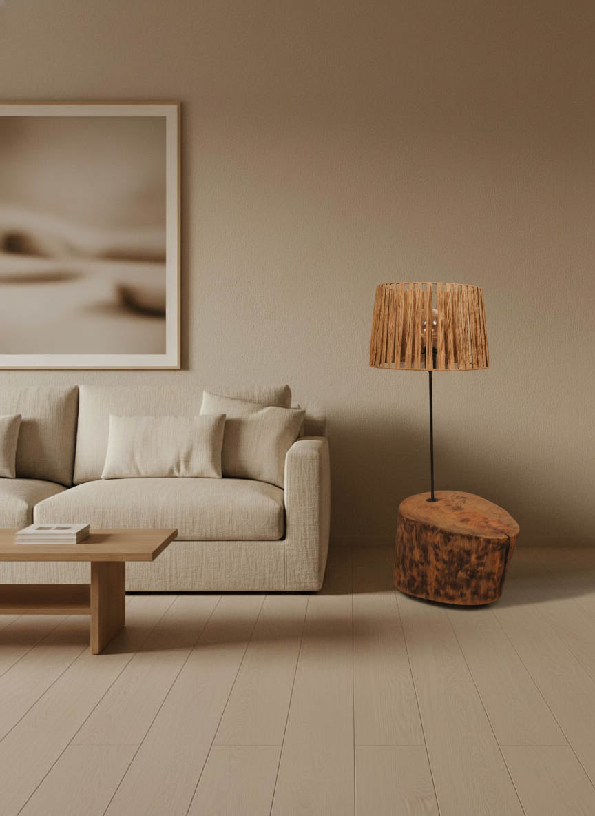 Da solidez da terra nasce o RAIZ, um candeeiro que parece brotar diretamente do coração da madeira. Com uma base maciça, quase bruta, mas suavemente trabalhada, transmite a força ancestral da natureza aliada à leveza de um design pensado para surpreender. A haste metálica, que se eleva com discrição até ao abajur generoso, faz lembrar um caule a crescer a partir do tronco, equilibrando peso e leveza, sombra e luz. RAIZ é um regresso às origens, onde cada veia da madeira conta uma história, e cada canto se preenche com calor, textura e presença.
