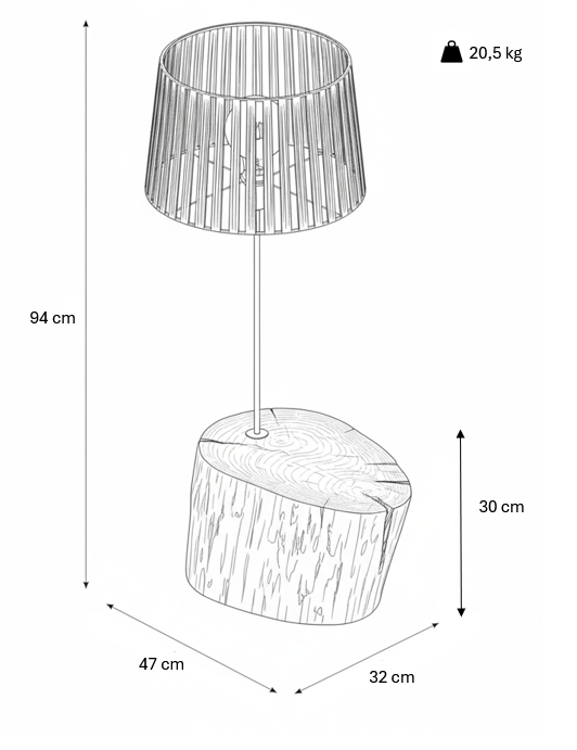 A base em madeira, moldada pelo tempo e transformada artesanalmente, é limpa, lixada, tratada contra insetos e fungos e tapa poros antes de receber um acabamento suave com cera de abelha natural, preservando as marcas, rachas e imperfeições que contam a sua história. O abajur, por sua vez, nasce de uma estrutura de arame moldada e soldada manualmente, à qual se entrelaça, fibra a fibra, a ráfia de papel — formando um desenho único de sombra e luz.