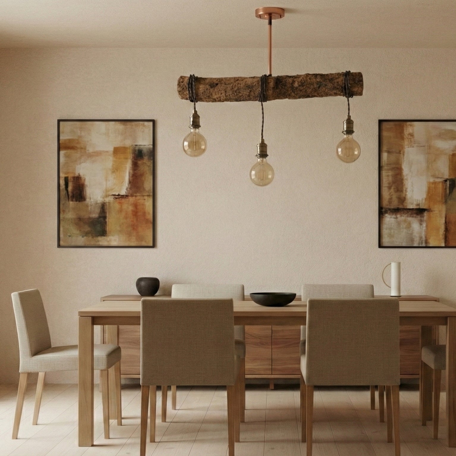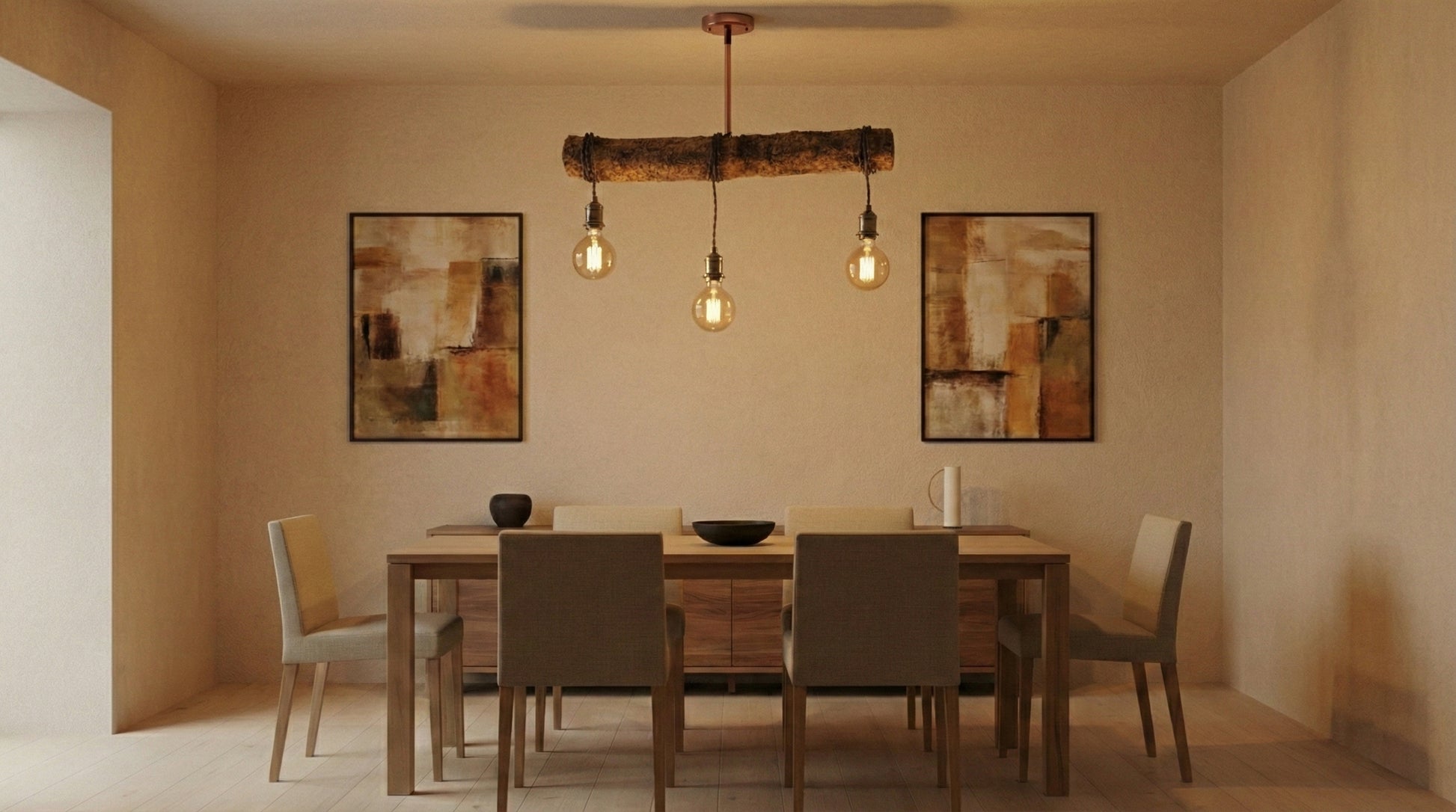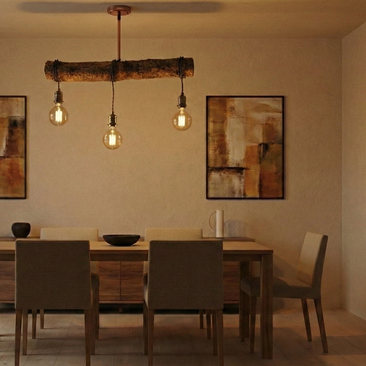 Um tronco maciço, marcado pelo tempo e pela natureza, serve de eixo a três pontos de luz que descem em alturas desencontradas, criando ritmo, profundidade e presença no espaço.