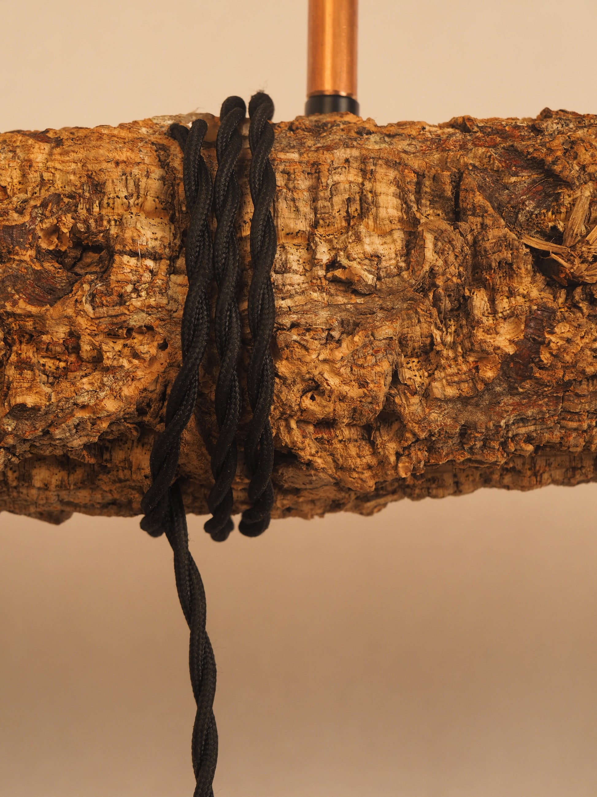 Cada cabo envolve o tronco em voltas naturais, num gesto simples e intencional, antes de libertar a luz. O tubo de cobre e a roseta no teto introduzem um detalhe quente e preciso, estabelecendo um diálogo subtil entre o rústico e o contemporâneo.