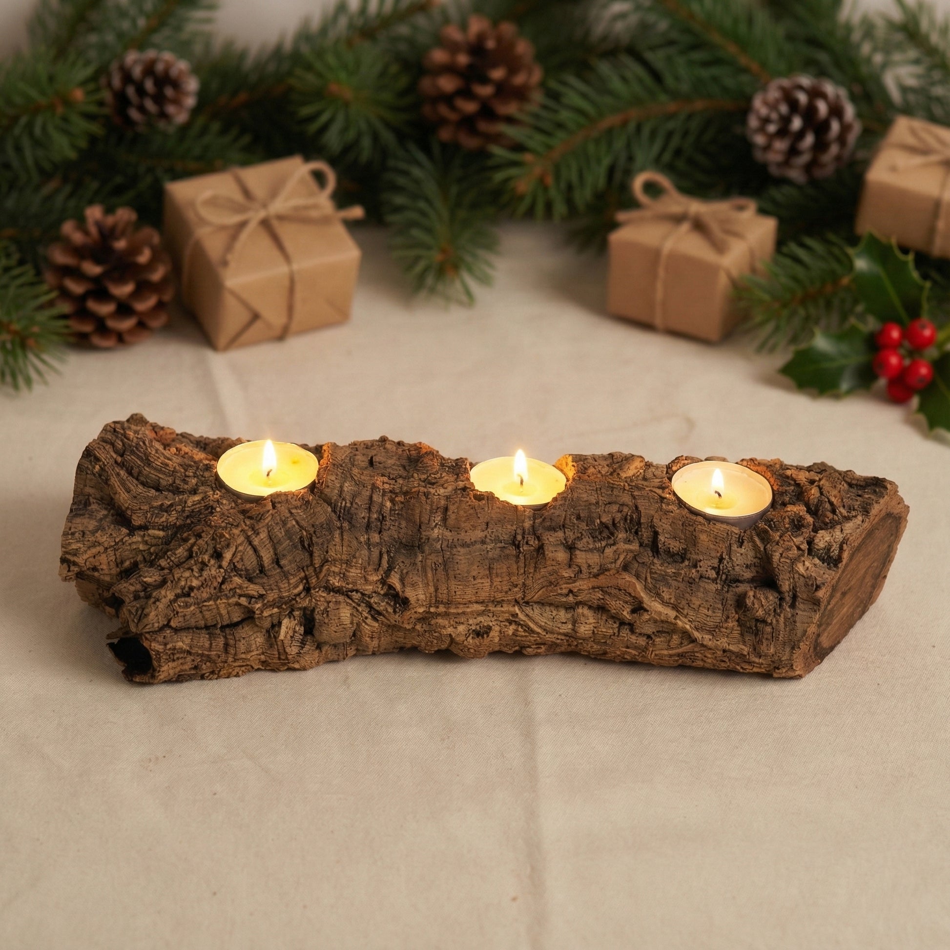 Alinho explora a simplicidade da forma horizontal e a repetição contida do gesto. Três velas, alinhadas ao longo de um ramo de sobreiro, criam uma composição limpa e naturalmente harmoniosa.