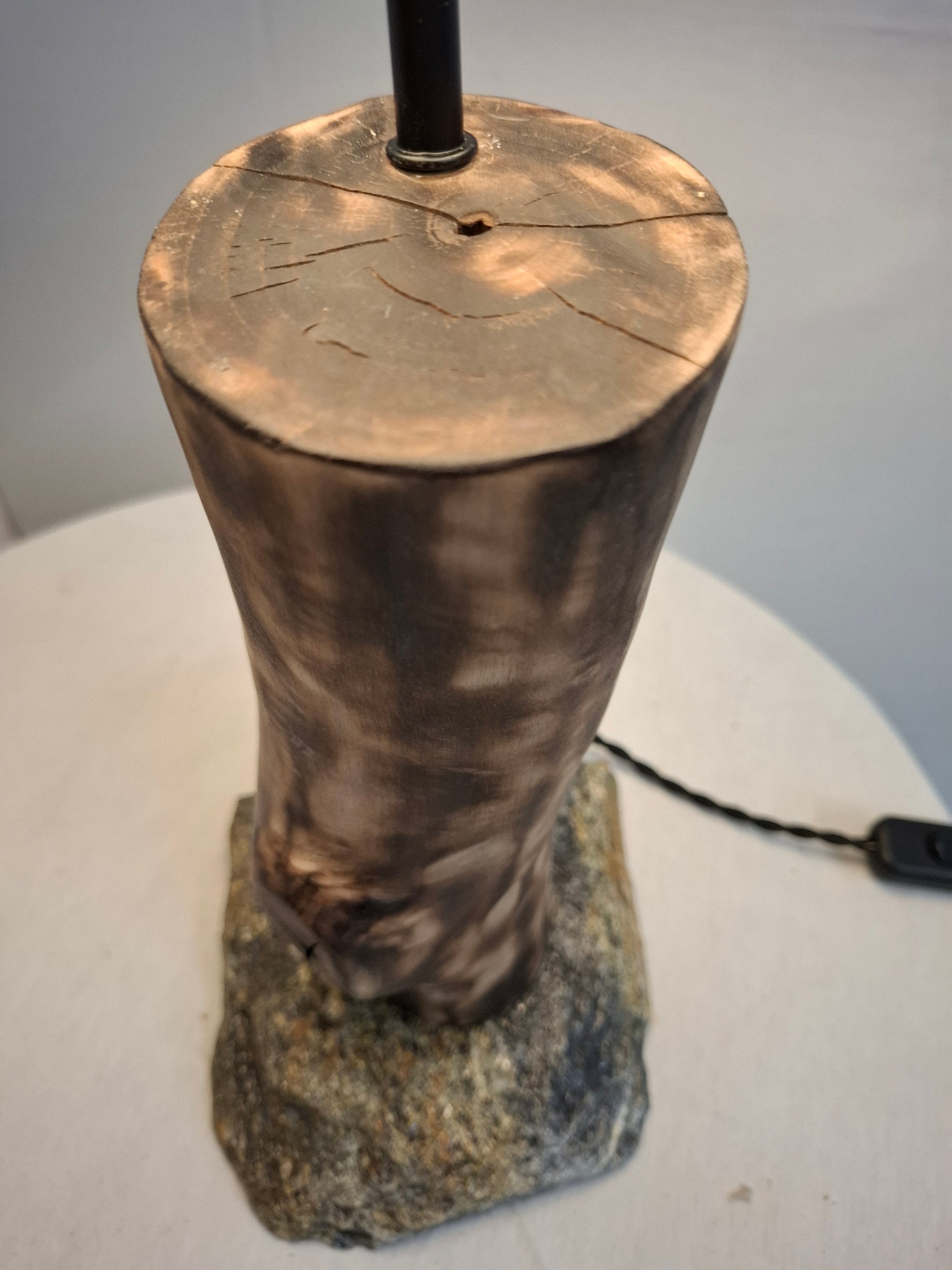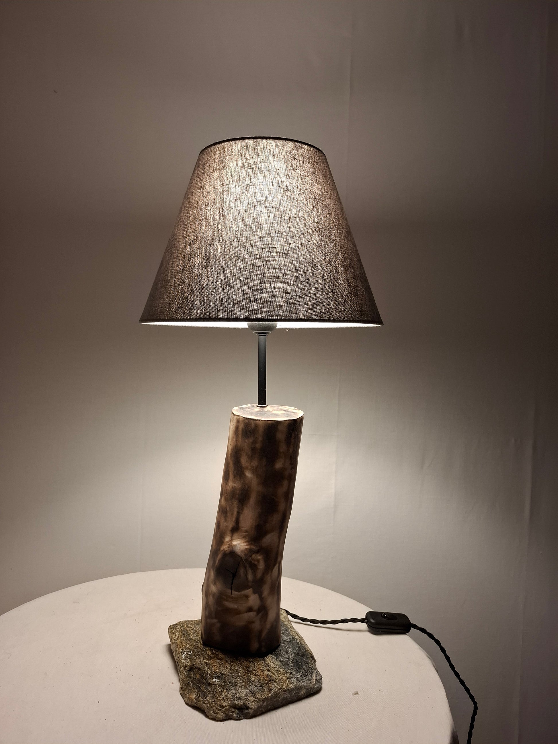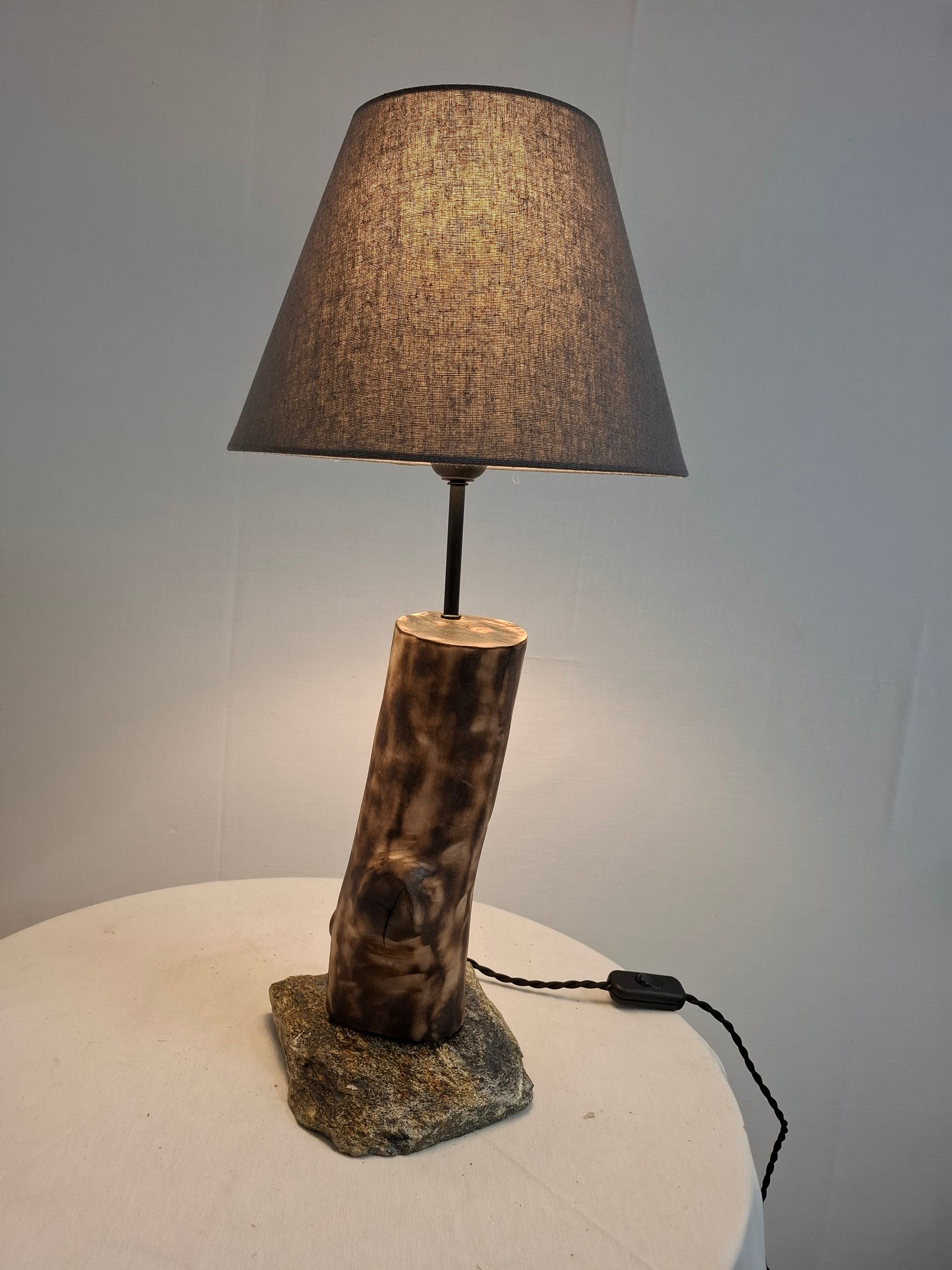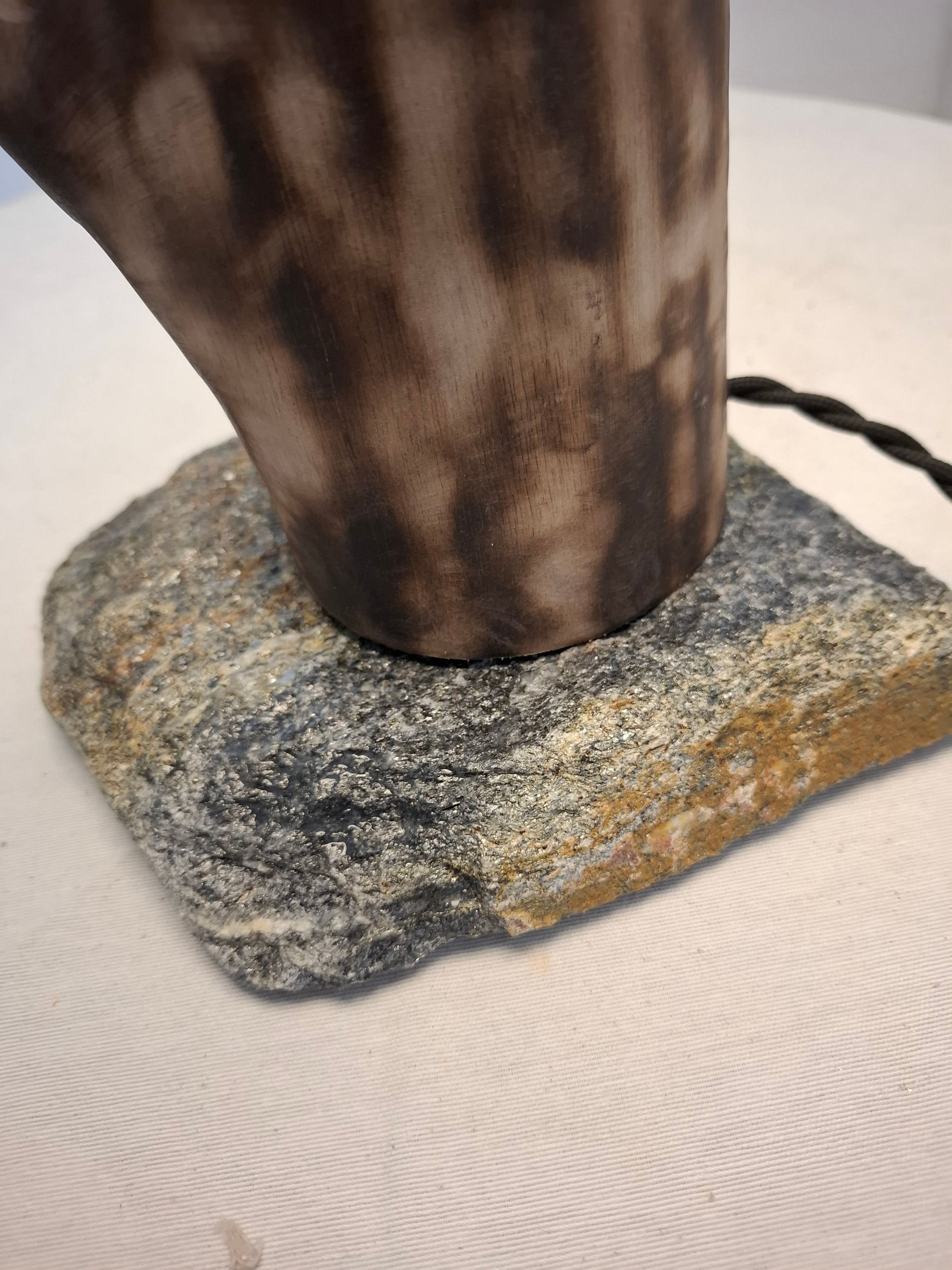 Brasa nasce do encontro entre tronco de nogueira, beijado por fogo suave, e uma laje bruta de xisto que sustenta a peça. As marcas carbonizadas revelam veios incandescentes, sugerindo lenha ainda quente. Da madeira irradia uma luz íntima que envolve o espaço em serenidade rústica, evocando o crepitar de uma lareira num fim de tarde de inverno.