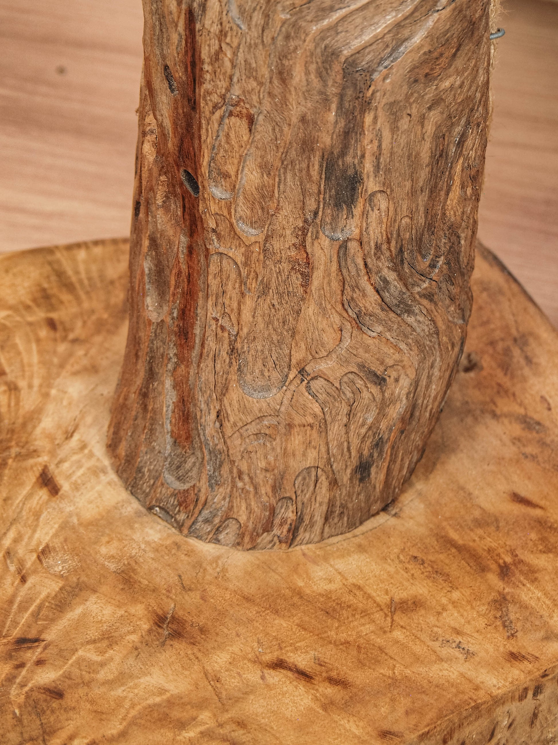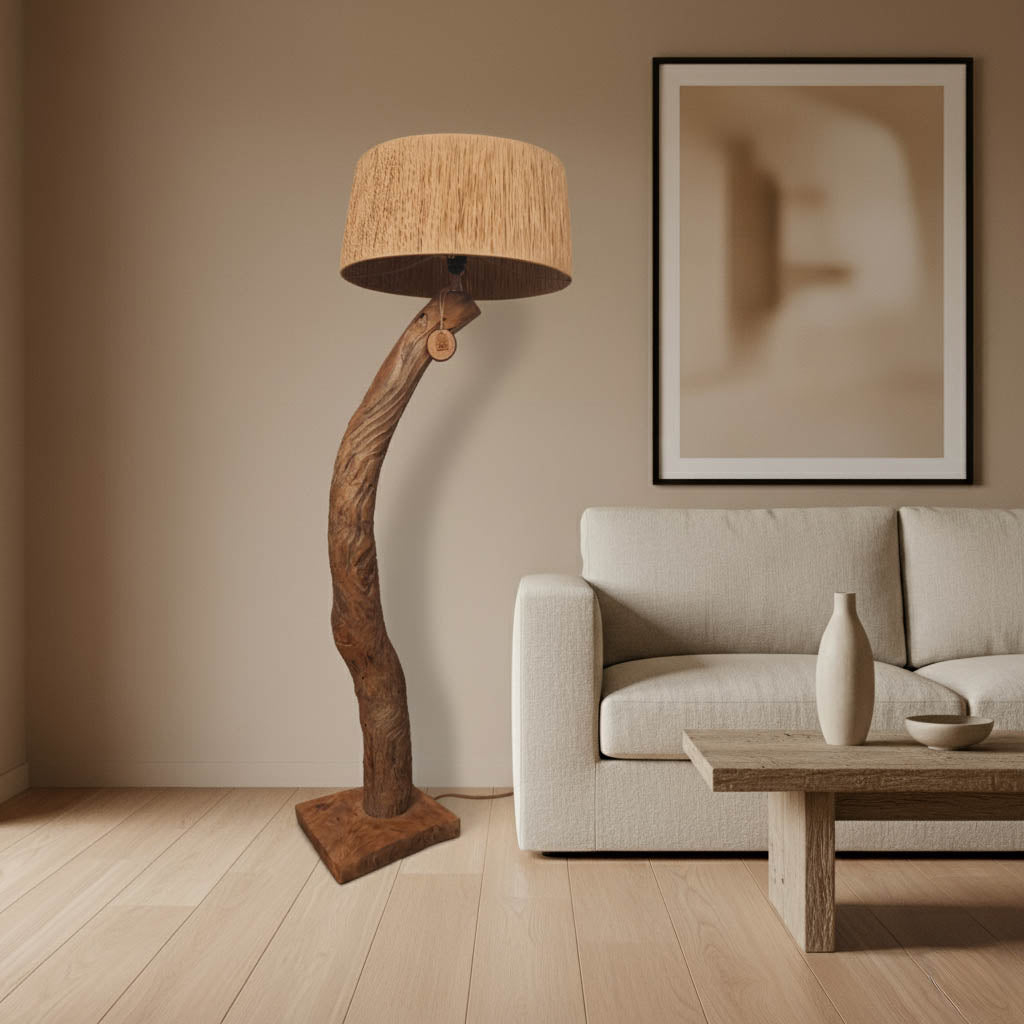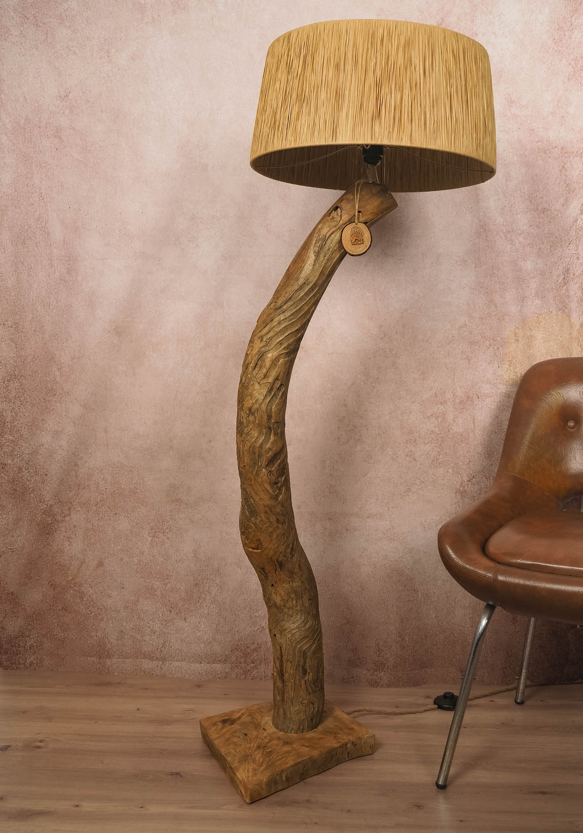 A base em madeira, moldada pelo tempo e transformada artesanalmente, é limpa, lixada, tratada contra insetos e fungos e tapa poros antes de receber um acabamento suave com cera de abelha natural, preservando as marcas, rachas e imperfeições que contam a sua história. O abajur, por sua vez, nasce de uma estrutura de arame moldada e soldada manualmente, à qual se entrelaça, fibra a fibra, a ráfia de papel — formando um desenho único de sombra e luz.